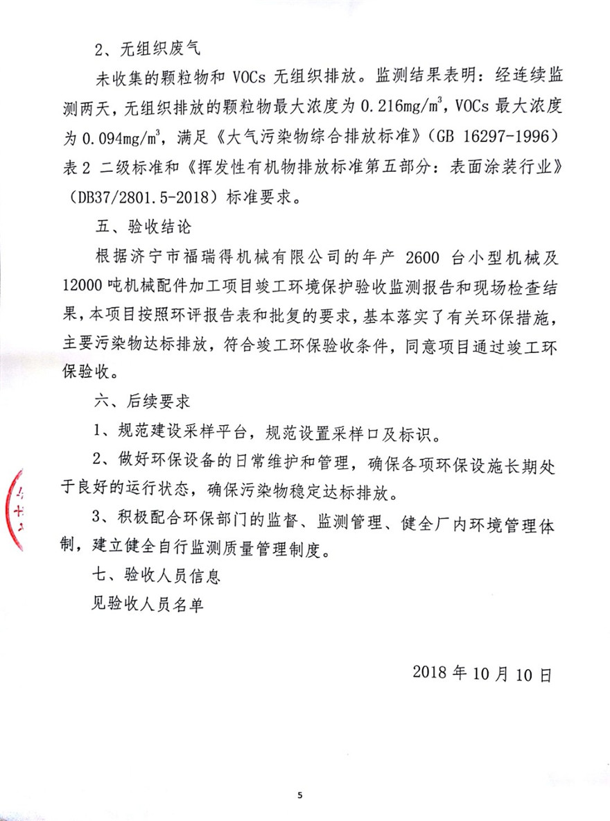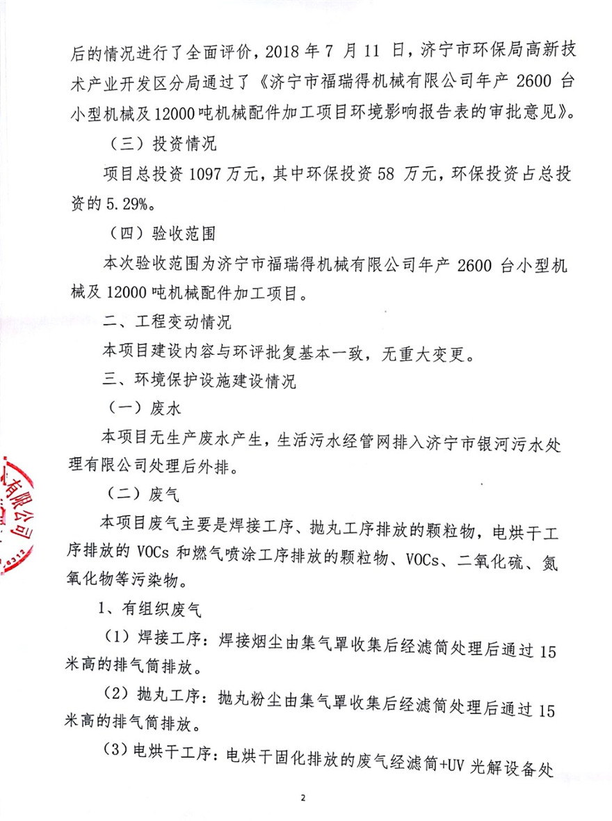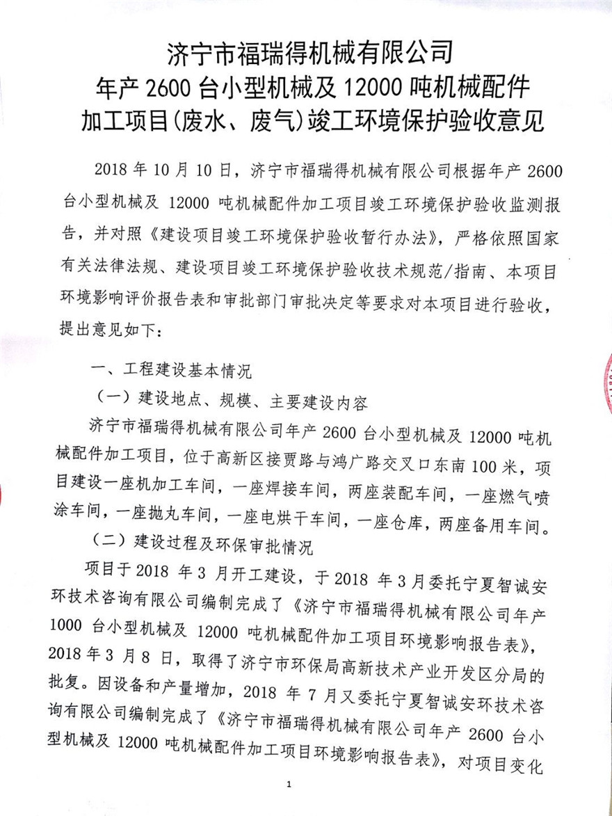 濟寧市福瑞得機械有限公司年產2600臺小型機械及12000噸機械配件加工項目(廢氣、廢水)竣工環境保護驗收意見