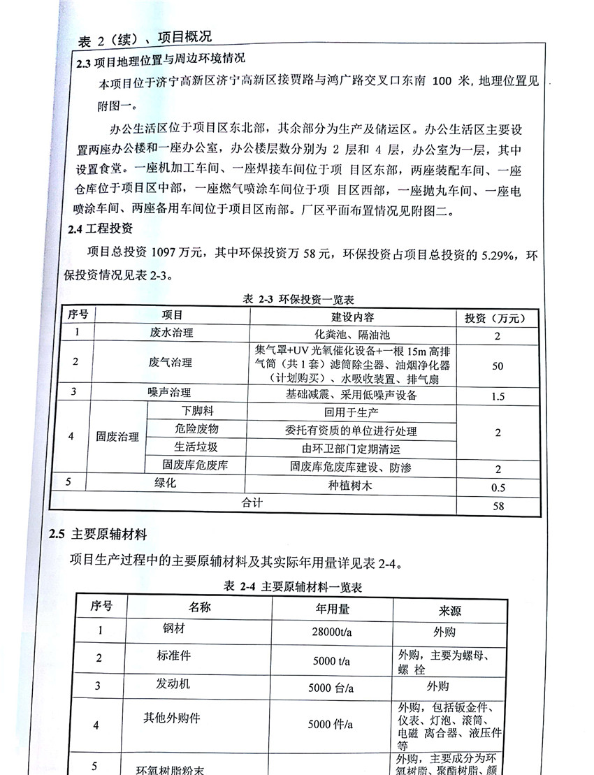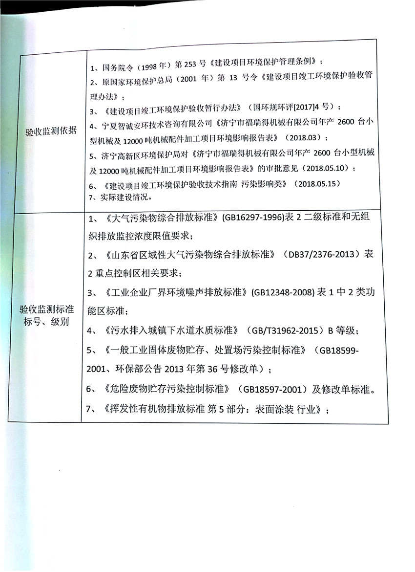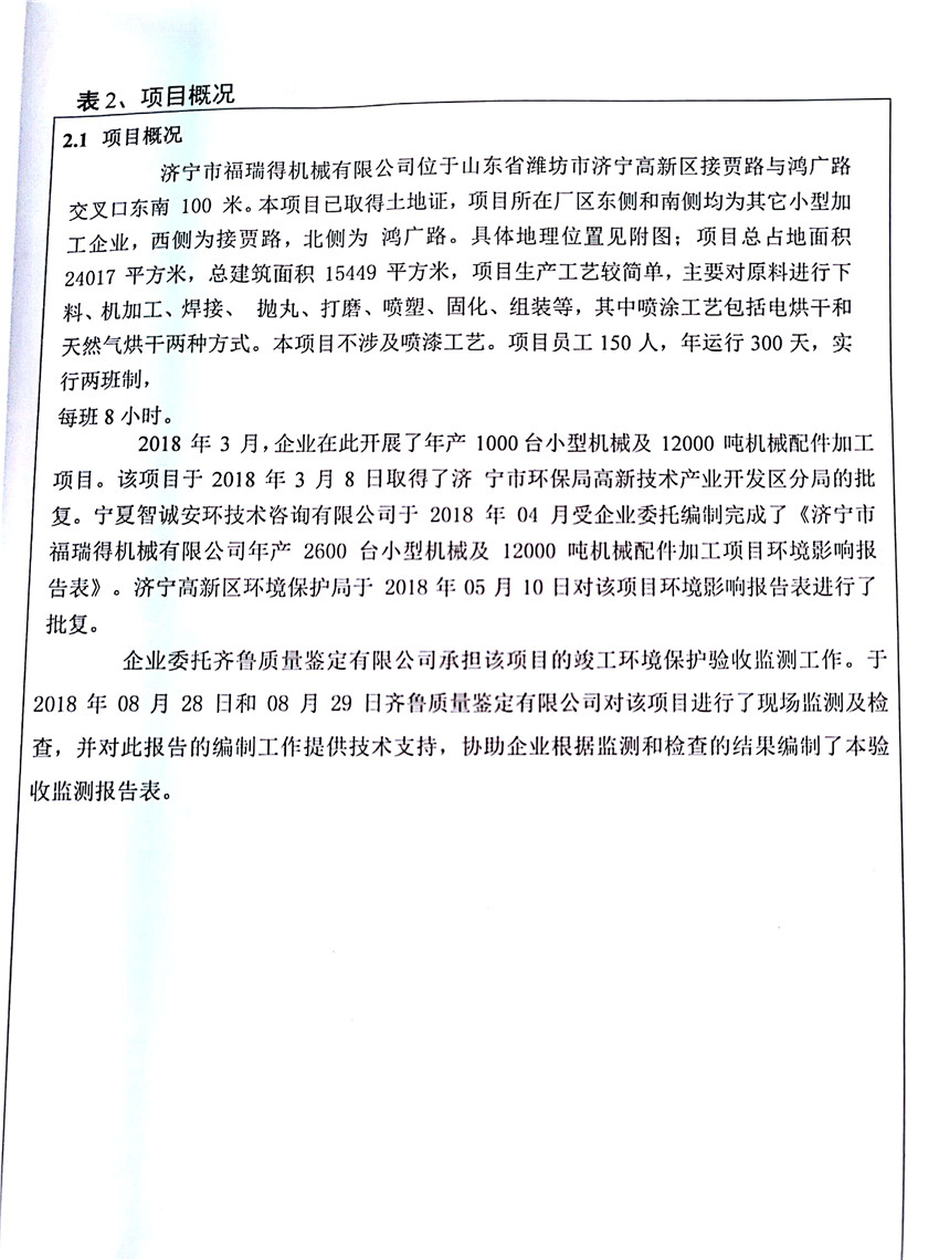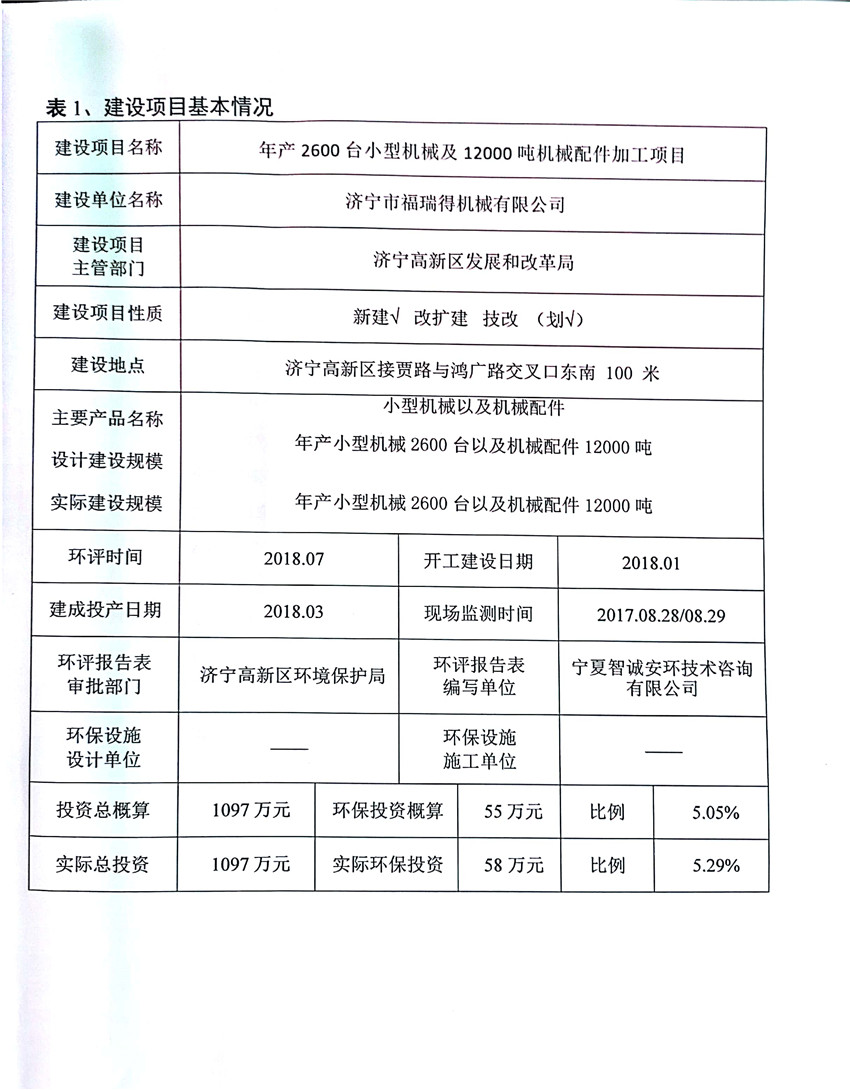 濟寧市福瑞得機械有限公司年產2600臺小型機械及12000噸機械配件加工項目(廢氣、廢水)竣