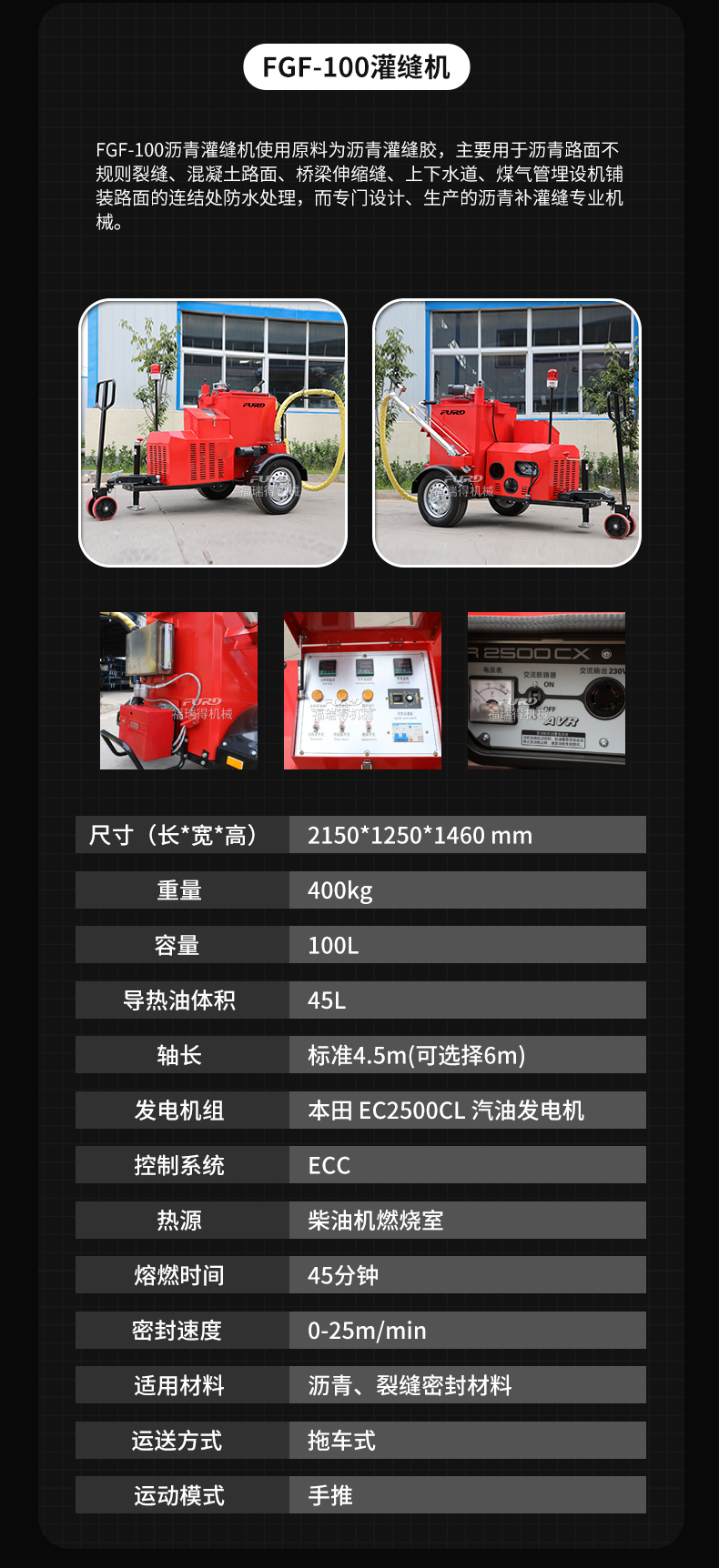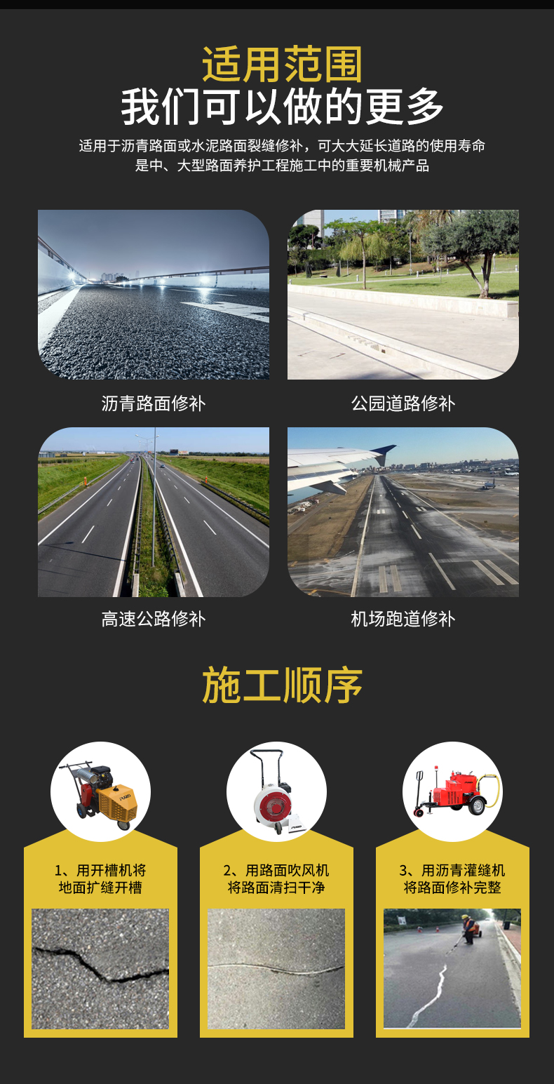 FGF-100瀝青灌縫機(jī)使用原料為瀝青灌縫膠,主要用于瀝青路面不規(guī)則裂縫、混凝土路面、橋梁伸縮縫、上下水道、煤氣管埋設(shè)機(jī)鋪裝路面的連結(jié)處防水處理,而專門設(shè)計(jì)、生產(chǎn)的瀝青補(bǔ)灌縫專業(yè)機(jī)械。