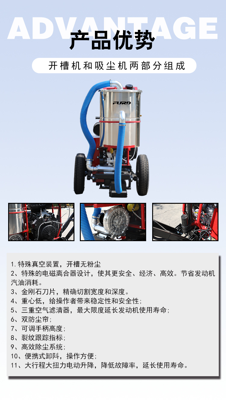 自吸塵式路面開槽機主要用于瀝青路面修補裂縫開槽的機械,其集吸塵、開槽為一體,環保性好,工作效果高,是路面開槽施工不錯的選擇。